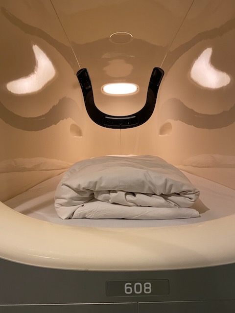 Our stomachs full, we headed into our capsule hotel. For the uninitiated, capsule hotels offer guests small, bed-sized rooms, or “capsules.” The first capsule hotel opened in 1979 in Osaka and was designed as a refuge for workers who were toiling away in their offices long after the last train home.