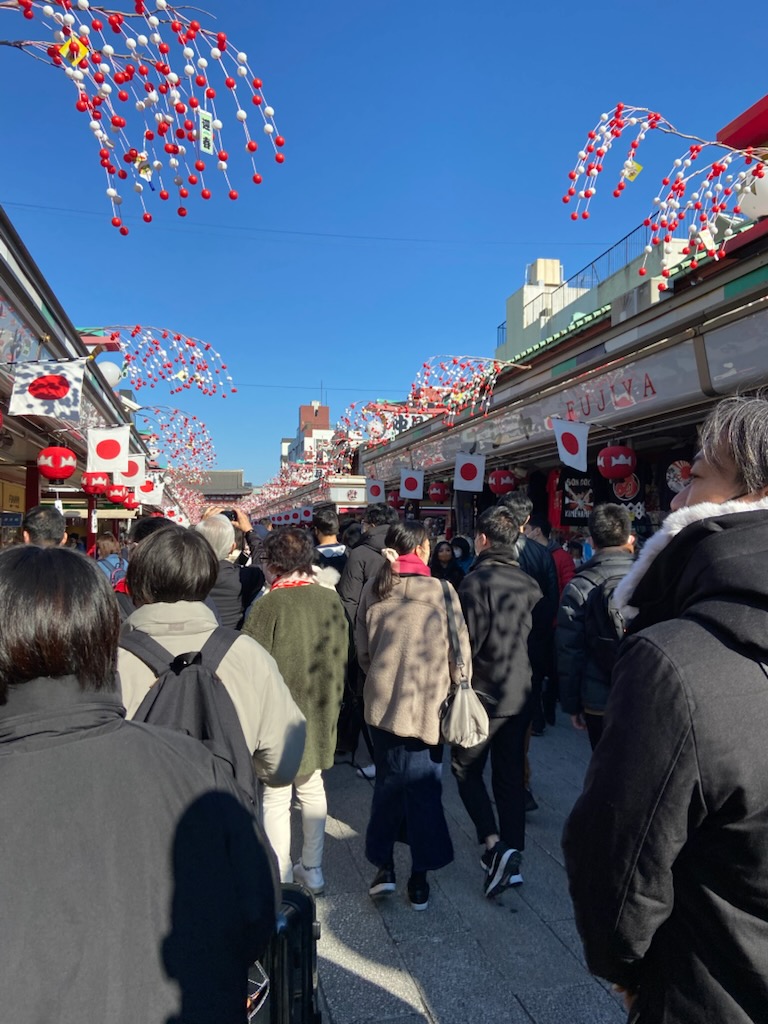 Constructed in the 7th century, the Buddhist temple is dedicated to Kannon, the goddess of mercy. Visitors enter through Kaminari Gate and stroll 200 meters down Nakamise, a bustling shopping street. It’s a popular tourist destination, and we were there on a national holiday, Coming of Age Day (Sejin no Hi), so there was an abundance of visitors.